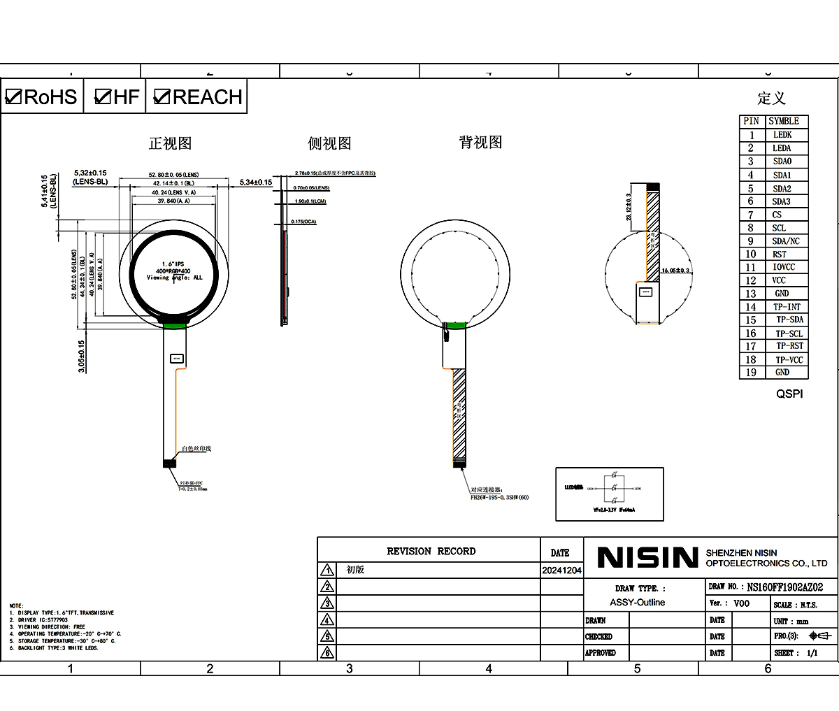 | 外形尺寸 | LCM Dimensions | 52.8*52.8*2.78mm | |