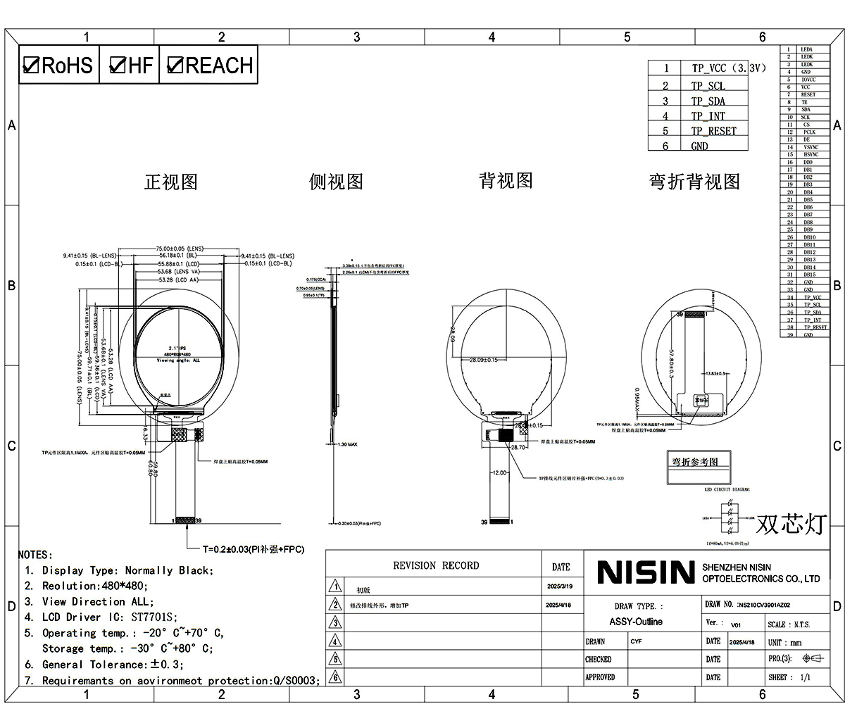| 外形尺寸 | LCM Dimensions | 75*75*3.39mm | |